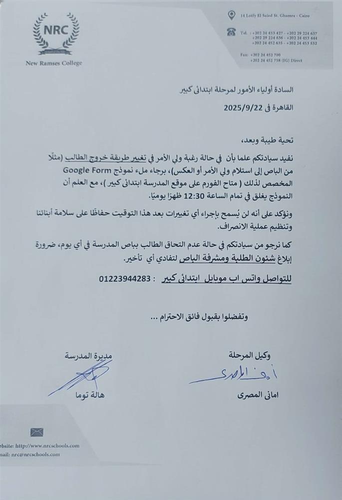 خاص بانصراف الطالب اليومى الاستثنائى خطاب